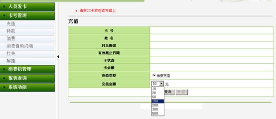 消费管理系统包括IC卡发卡、充值、挂失、消费、转款、消费统计等功能。